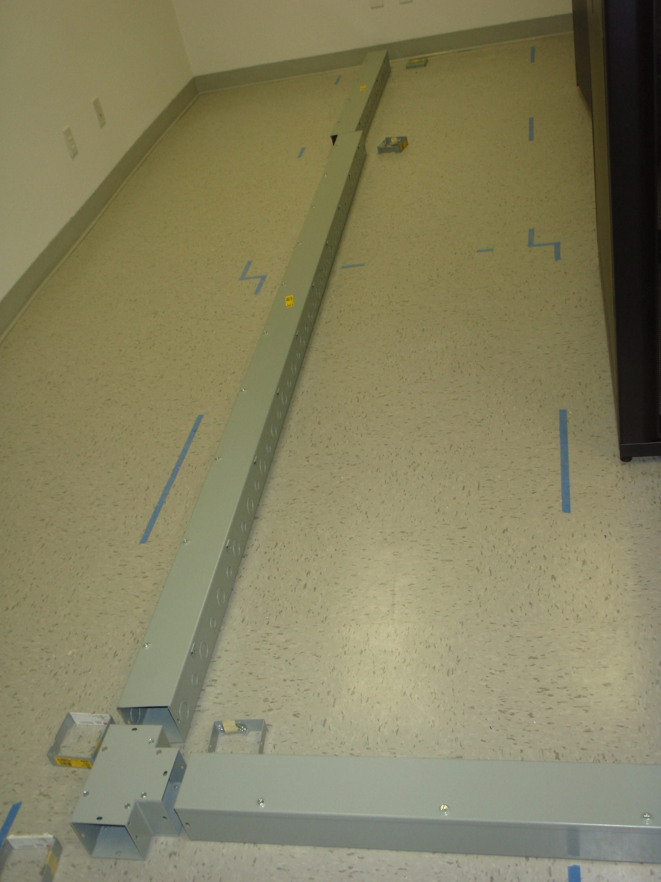 Although we are still missing the UPS (now due to arrive on Sept. 16), we did receive the paralleling tie cabinet and started installing the wiring troughs in the server room that will carry the overhead electrical in the server room. They will eventually be installed overhead, but they’re pictured here laid out on the floor to ensure all the bits and pieces that make them up are accounted for and assigned a position in the installation. The paralleling cabinet will feed a distribution panel and provides an isolated bypass point for the UPS cluster via the large 350A breaker. We’ve also included an updated picture of the telco room.